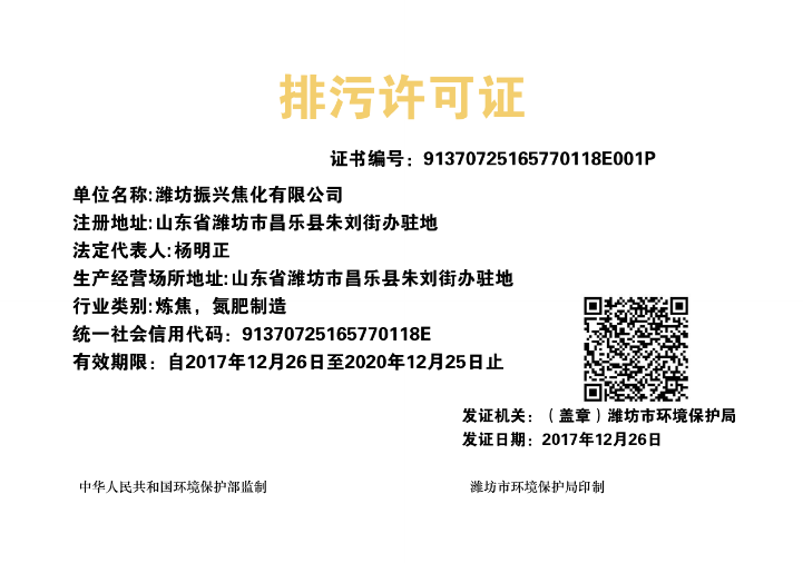 經(jīng)過近一個月的共同努力,振興焦化公司終于如期完成了環(huán)保排污許可證的辦理工作,12月26日,環(huán)保排污許可證順利發(fā)放,