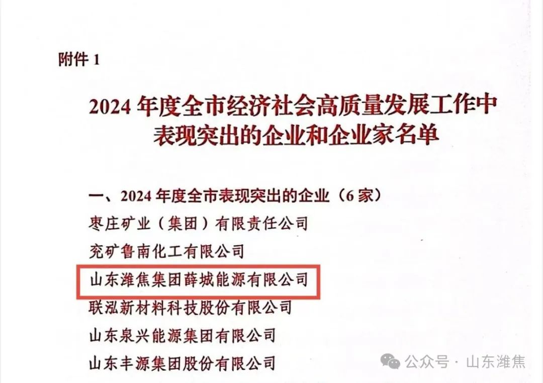 薛城能源公司榮獲“高質量發展工作突出企業”榮譽稱號